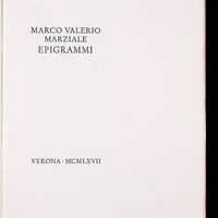 Nel colophon si legge: “Dal torchio privato di Alessandro Corubolo e Gino Castiglioni esce questa novissima edizione di alcuni epigrammi di Marco Valerio Marziale illustrati con due acqueforti a colori di Enrico Baj. L’edizione si suddivide in: quaranta copie numerate da 1 a 40 con otto epigrammi in latino e la loro versione italiana espressamente curata da Roberto Sanesi; quaranta copie numerate da I a XL con sedici epigrammi in latino. Alle prime dieci copie di ogni edizione è aggiunta una suite di acqueforti, alle prime due è aggiunto anche un disegno originale di Enrico Baj. Quest’è l’esemplare numero 10. In Verona, nell’autunno mcmlxvii.”