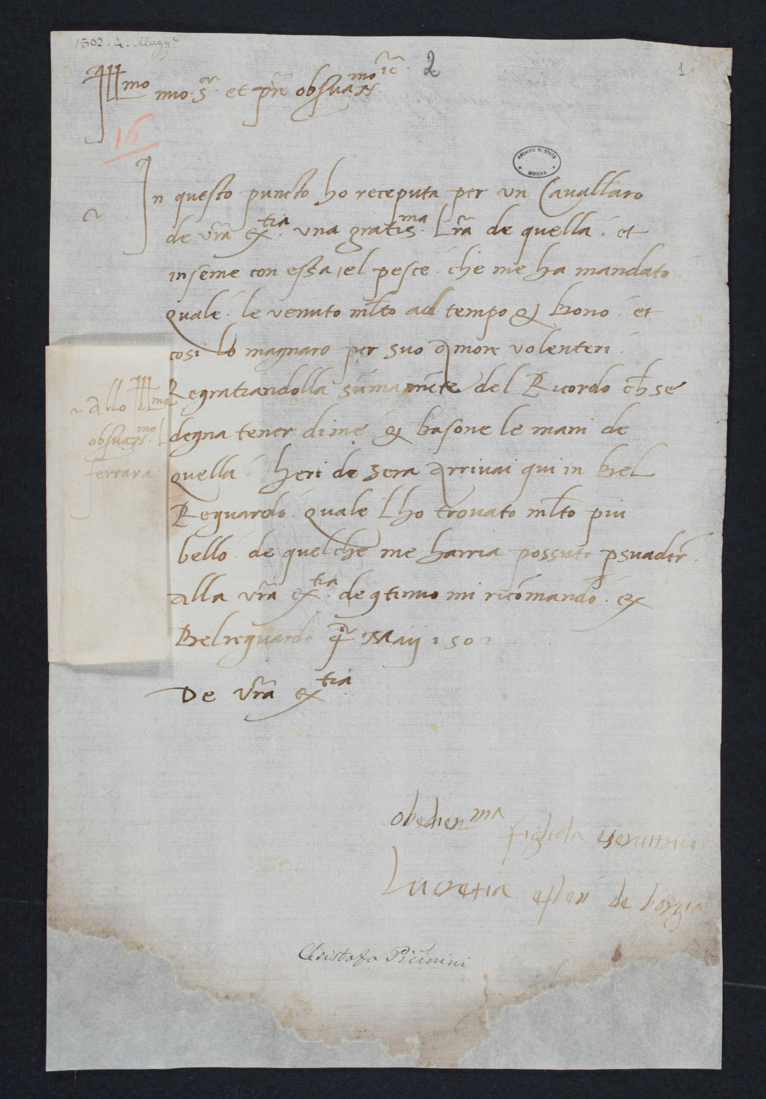 Part of 16. Lettera di Lucrezia Borgia ad Ercole I. Belriguardo, 4 maggio 1502.