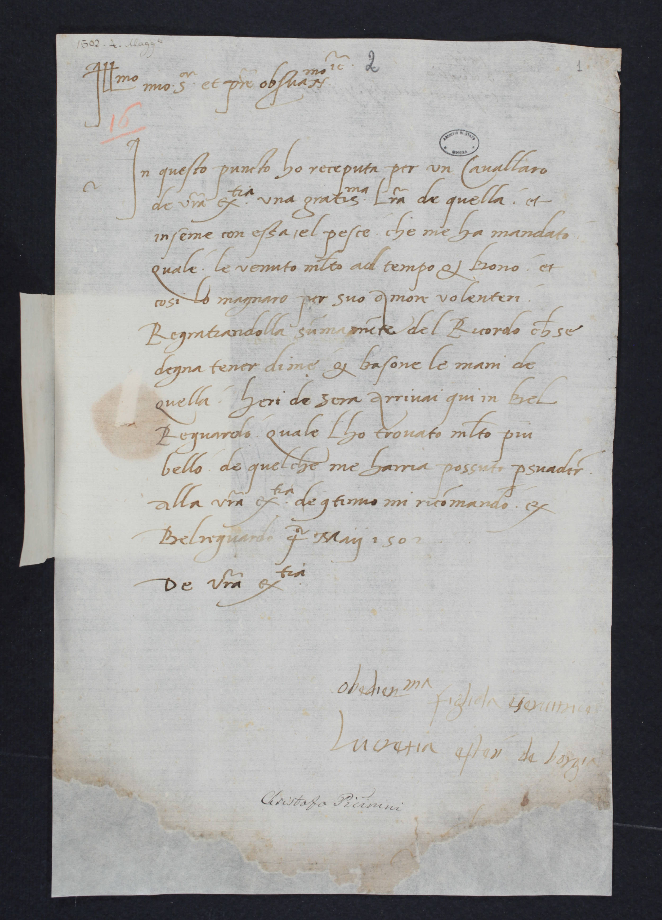 Part of 16. Lettera di Lucrezia Borgia ad Ercole I. Belriguardo, 4 maggio 1502.