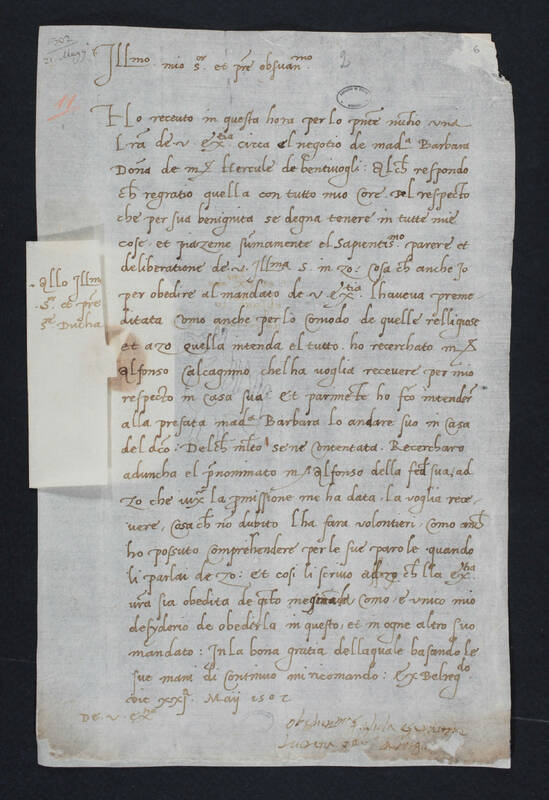 Part of 19. Lettera di Lucrezia Borgia ad Ercole I. Belriguardo, 21 maggio 1502.