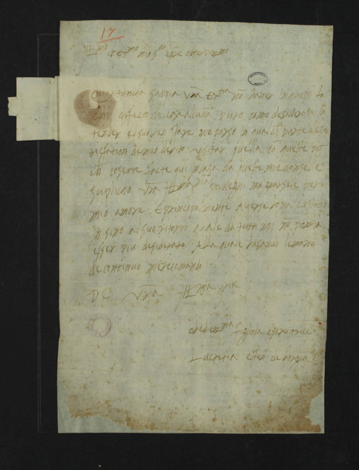 Part of 25. Lettera autografa di Lucrezia Borgia ad Ercole I d'Este. <Roma, post ottobre 18- ante 20 novembre (?)>.