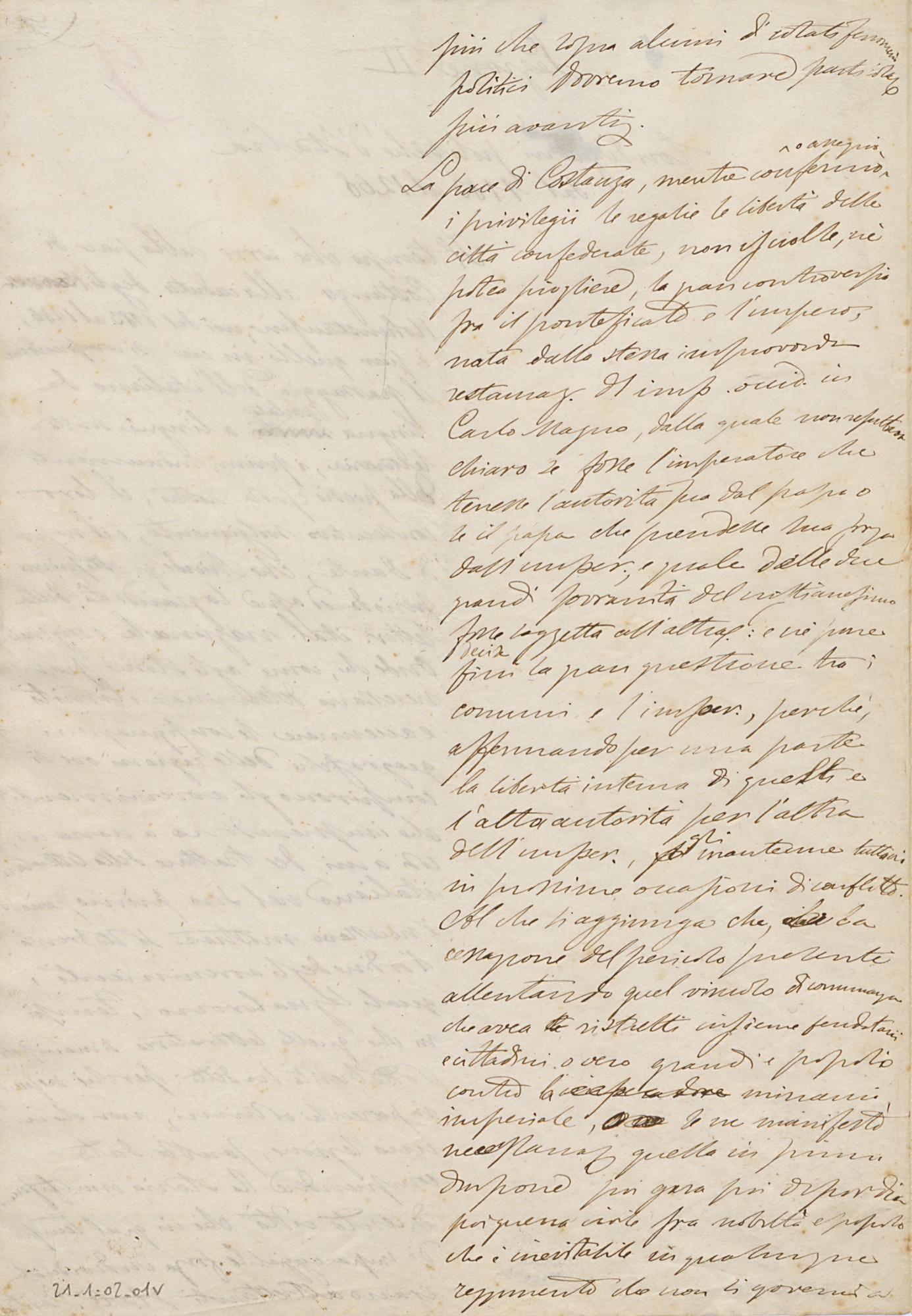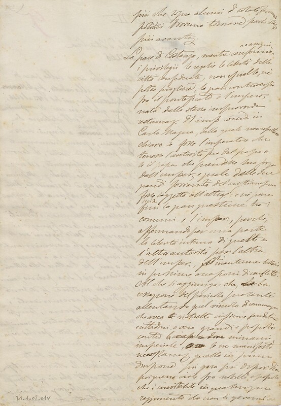 Part of Giosue Carducci, Introduzione allo studio su Dante e il secolo XIV. Lingua e letteratura dal 1183 al 1268, Condizioni politiche d’Italia, lezione II e III del corso, Biblioteca di Casa Carducci, Cart. XXI, 1, II