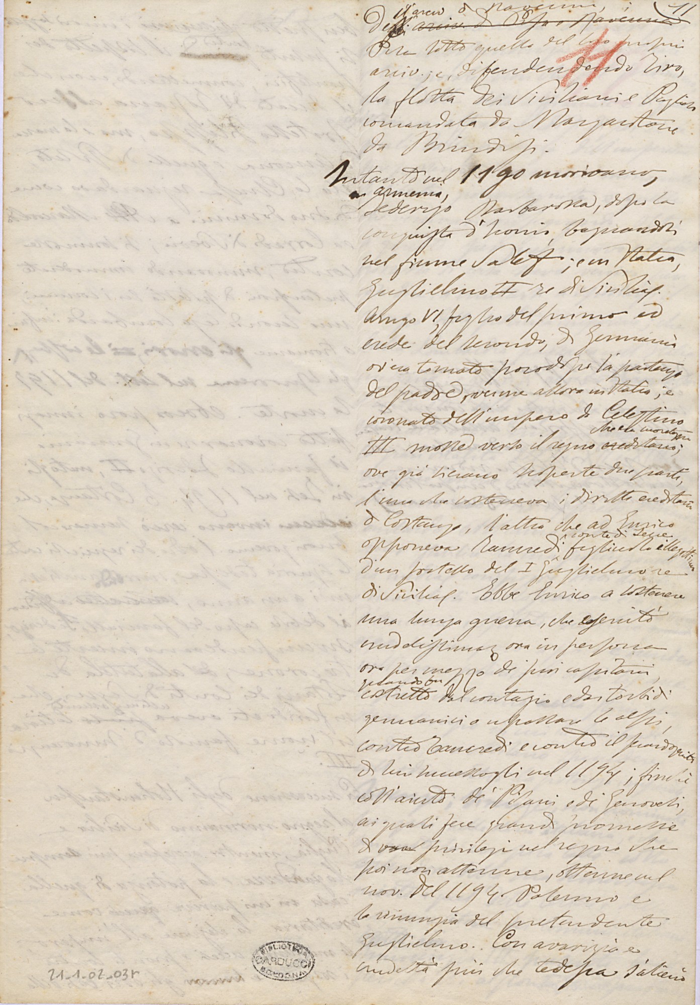 Part of Giosue Carducci, Introduzione allo studio su Dante e il secolo XIV. Lingua e letteratura dal 1183 al 1268, Condizioni politiche d’Italia, lezione II e III del corso, Biblioteca di Casa Carducci, Cart. XXI, 1, II
