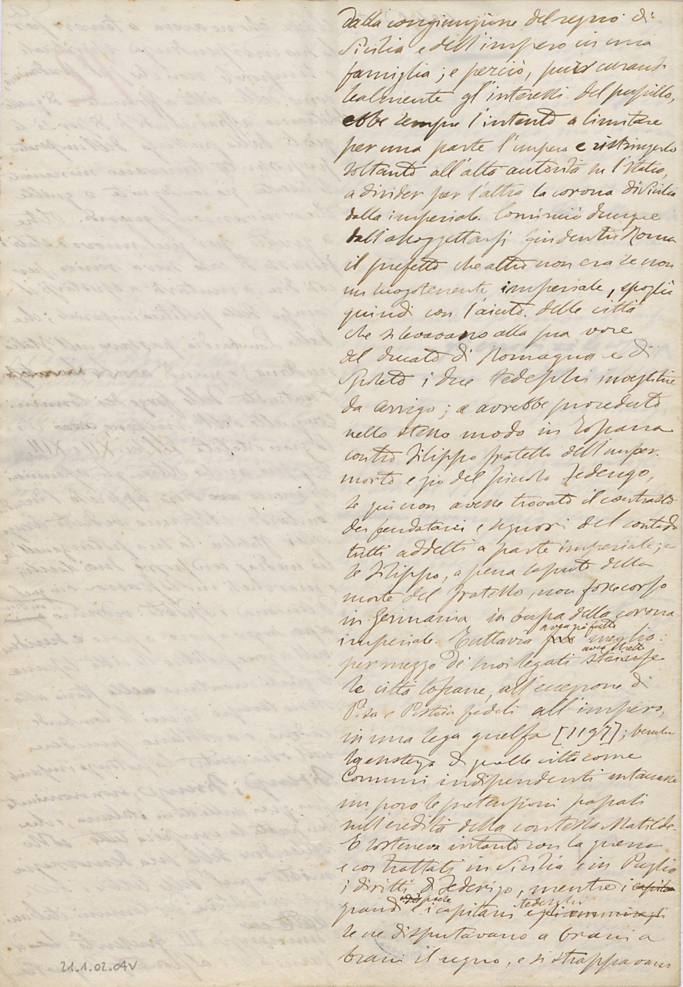 Part of Giosue Carducci, Introduzione allo studio su Dante e il secolo XIV. Lingua e letteratura dal 1183 al 1268, Condizioni politiche d’Italia, lezione II e III del corso, Biblioteca di Casa Carducci, Cart. XXI, 1, II