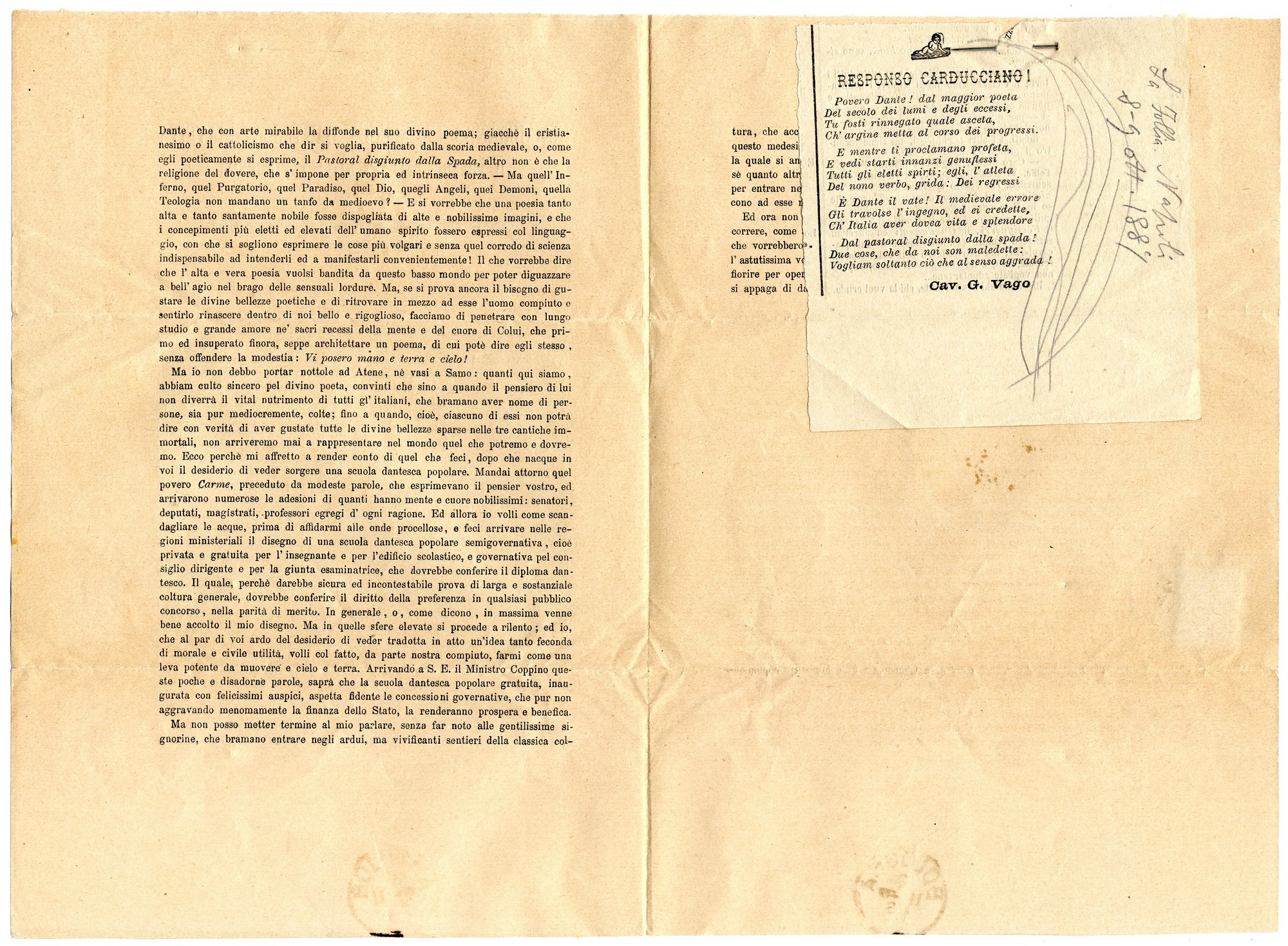 Giosue Carducci, Intorno alla cattedra dantesca, sett. 1887, due lettere e un telegramma, Biblioteca di Casa Carducci, Cart. VIII 7_lettera a stampa_v con foglietto