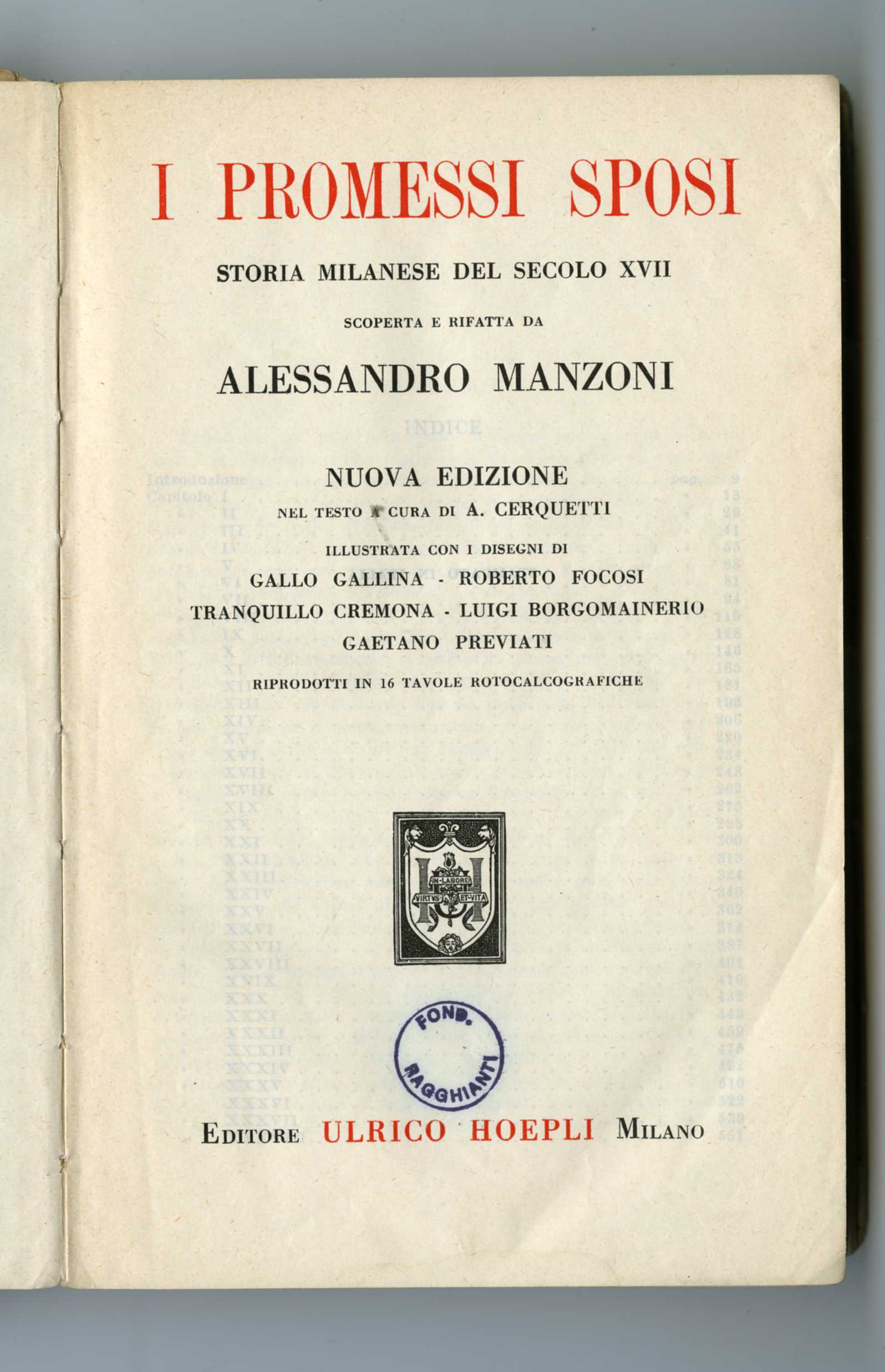 Manzoni Alessandro, I promessi sposi, scoperta e rifatta da Alessandro Manzoni, nuova edizione del testo a cura di A.[lfonso] Cerquetti, illustrata con i disegni di Gallo Gallina, Roberto Focosi, Tranquillo Cremona, Luigi Borgomainerio, Gaetano Previati, riprodotti in 16 tavole rotocalcografi che, Milano, Hoepli, 1948