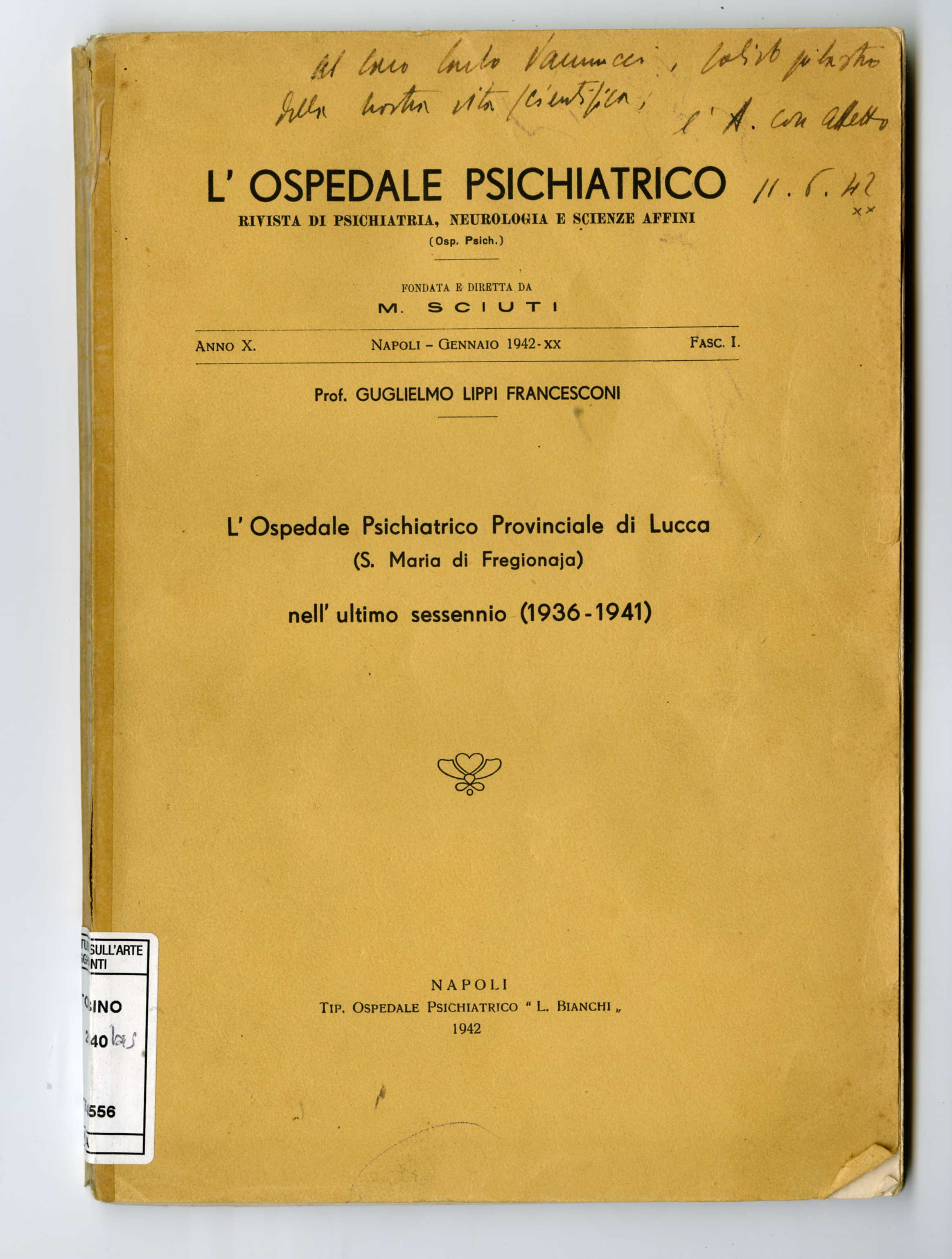Guglielmo Lippi Francesconi, L’Ospedale Psichiatrico Provinciale di Lucca (S. Maria di Fregionaja) nell’ultimo sessennio (1936-1941). Estr. da: “L’Ospedale Psichiatrico. Rivista di psichiatria, neurologia e scienze affi ni”, a. X, fasc. 1, gennaio 1942.