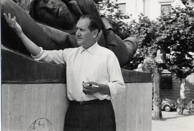 Part of Mario Tobino davanti al monumento ai Caduti di Lorenzo Viani