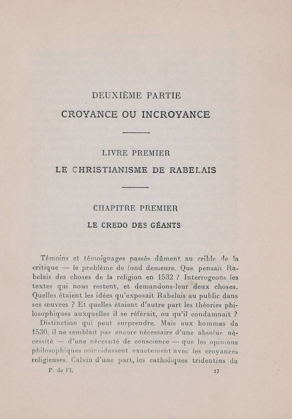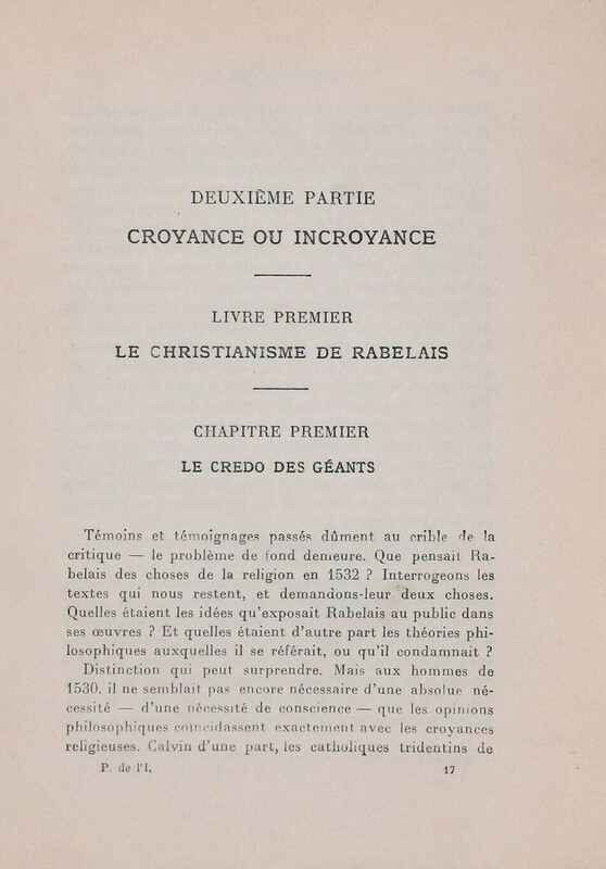 Le probleme de l'incroyance au 16. siécle: la religion de Rabelais