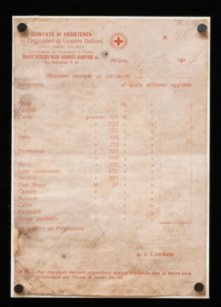 Ricevute di pacchi alimentari spediti dalla famiglia Gadda e dalla Croce Rossa Italiana