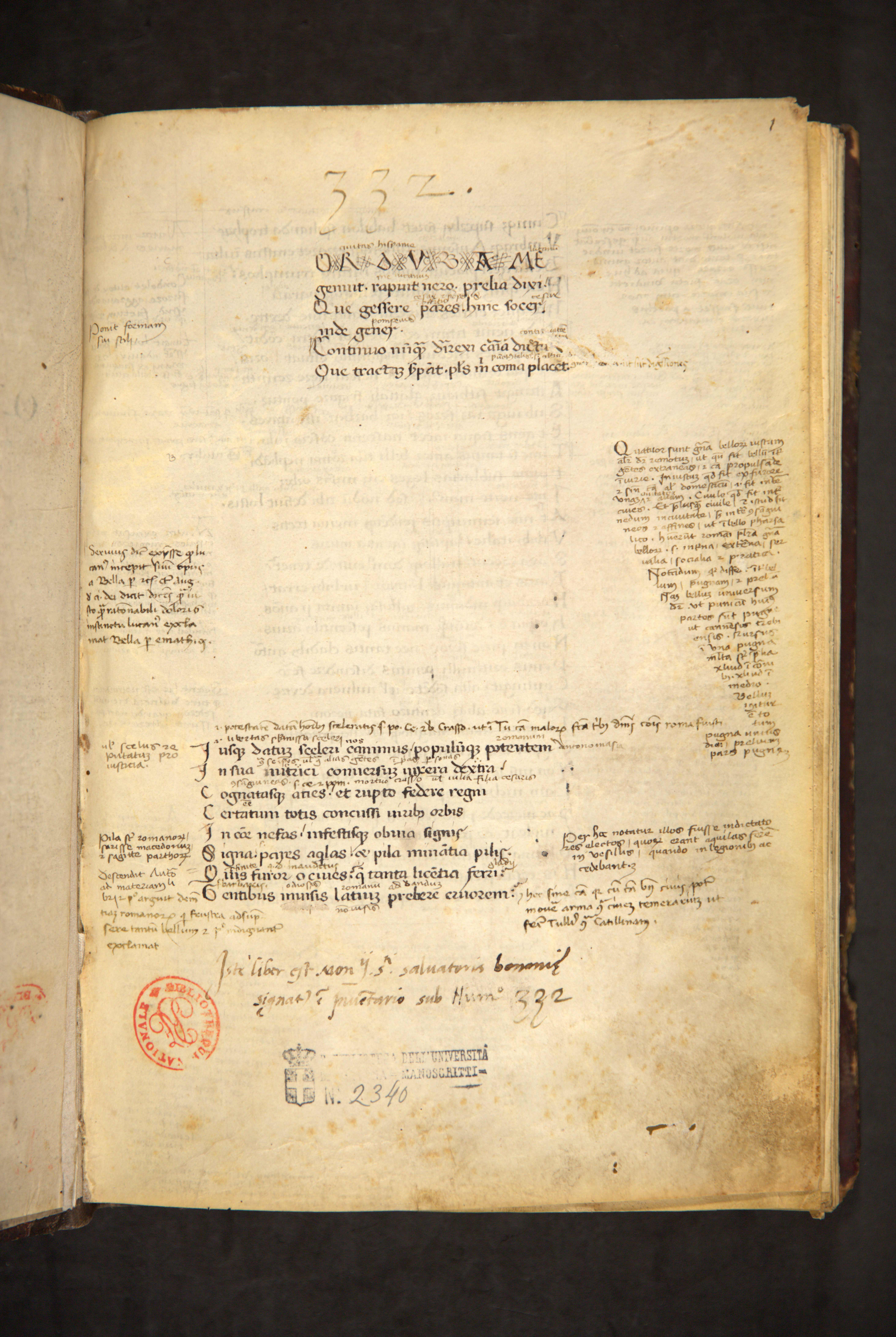 Part of Lucano, Bellum civile, Biblioteca Universitaria di Bologna, ms. 2340, c.1r