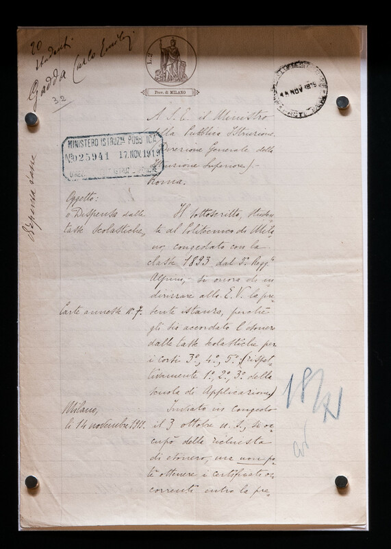 Con la domanda, autografa, datata «Milano, li 14 novembre 1919» – il giorno del 26° compleanno di Gadda, che riprende gli studi dopo l’interruzione della guerra e della prigionia – al Ministro della Pubblica Istruzione, Direzione Generale della Istruzione Superiore, Gadda chiede la dispensa dalle tasse scolastiche «per i Corsi 3.°, 4.°, 5.° (rispettivamente 1.°, 2.°, 3.° della Scuola di Applicazione».