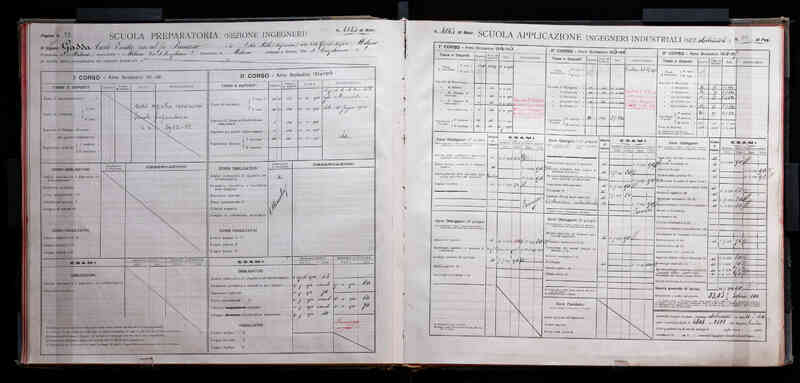 Il registro, aperto alle pagine relative a Carlo Emilio Gadda, documenta la sua carriera universitaria, dal secondo anno di corso della Scuola Preparatoria (pagina di sinistra), al Triennio di Applicazione per Ingegneri Industriali, fino al conseguimento della laurea (pagina di destra).
