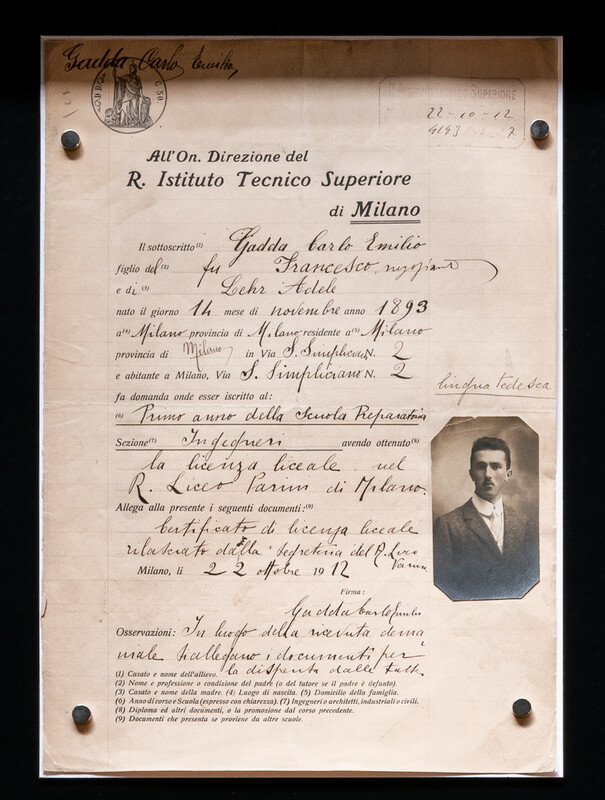 Carlo Emilio Gadda, ottenuta la maturità al Liceo Parini nel 1912, il 22 ottobre presenta domanda di iscrizione al primo anno della Scuola Preparatoria del Regio Istituto Tecnico Superiore di Milano, chiedendo la «dispensa dalle tasse».