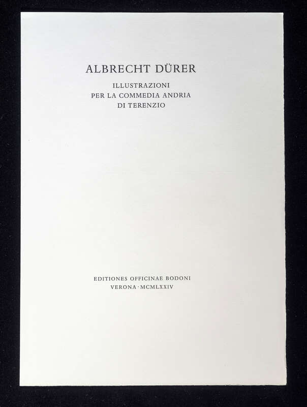 Il volume contiene traduzione (rispettivamente in italiano, tedesco e inglese) dell’Andria di Terenzio, accompagnata da 25 xilografie; segue studio di Giovanni Mardersteig, a sua volta corredato da alcune riproduzioni, sul giovane Dürer a Basilea e sulle edizioni illustrate del Terenzio di quel periodo. Le 25 xilografie che accompagnano il testo di Terenzio sono state incise per questa edizione da Fritz Kredel (1900-1973); esse riproducono i disegni originali del giovane Dürer (1492 circa), realizzati su legni mai completati e oggi conservati nel Kunstmuseum di Basilea. Le illustrazioni di Dürer erano destinate ad essere stampate in un’edizione delle Commedie di Terenzio progettata da Johann Amerbach (Basilea); questo progetto editoriale, tuttavia, non trovò realizzazione a causa della pubblicazione, nel 1493, dell’edizione illustrata di Terenzio di Johann Trechsel (Lione).