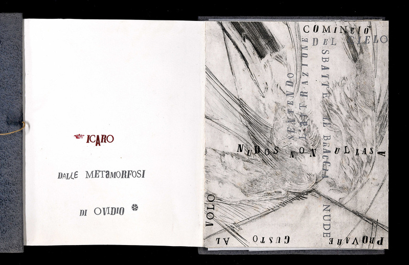 Due libri d’artista a leporello, ciascuno realizzato con sei prove di stampa, in cui parole e immagini si fondono per dare corpo a un’originale rielaborazione di due tra i più celebri episodi ovidiani: il tragico volo di Icaro (Ou. Met. 3, 138-259) e la morte di Atteone, trasformato in cervo e divorato dai suoi stessi cani (Ou. Met. 8, 183-262).