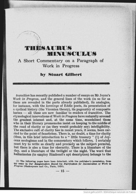 Il saggio Prolegomena to ‘Work in Progress’ firmato da Gilbert, contenuto nell’Exagmination del 1929, apparve originariamente su «transition» nel 1928 solo come A Prolegomenon to ‘Work in Progress’, in forma ridotta, senza cioè diversi riferimenti al testo, né glossari e commenti poi aggiunti nella seconda redazione. In esso, Gilbert dà prova delle sue doti critiche e traccia un'affascinante connessione tra il pensiero filosofico di Giambattista Vico e l’opera di James Joyce, con particolare attenzione al Work in Progress. Nonostante la difficoltà del testo joyciano, che spesso disorienta il lettore con la sua caotica complessità, Gilbert sottolinea che questa sfida può essere colta riprendendo il pensiero di Vico, riferimento cruciale per comprendere la struttura narrativa del romanzo. In effetti, per Gilbert l’opera di Joyce è una realizzazione concreta della concezione vichiana della storia, intesa come un processo ciclico e universale che non dipende da eventi isolati o geniali, quanto più da un movimento irrefrenabile e continuo dell'umanità.