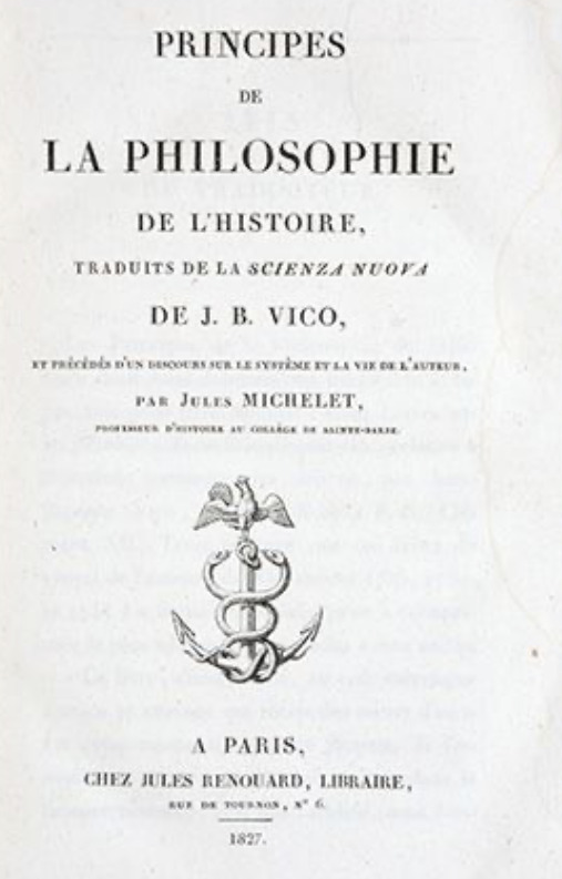 Nel 1824, mentre era impegnato nei suoi studi sulla filosofia della storia, Michelet scoprì Vico attraverso la prima edizione della Scienza nuova pubblicata nel 1725, un testo allora poco conosciuto fuori dall’Italia. Affascinato dall’audacia speculativa e dalla profondità della concezione storica vichiana, intraprese un compito di capitale importanza: la prima traduzione francese della Scienza nuova, intitolata Principes de la Philosophie de l'Histoire, traduits de la Scienza nuova de J.B. Vico, et précédés d'un discours sur le système et la vie de l'auteur (1827), non una semplice resa linguistica, ma una vera e propria interpretazione volta a rendere accessibile il pensiero di Vico ai lettori francesi.