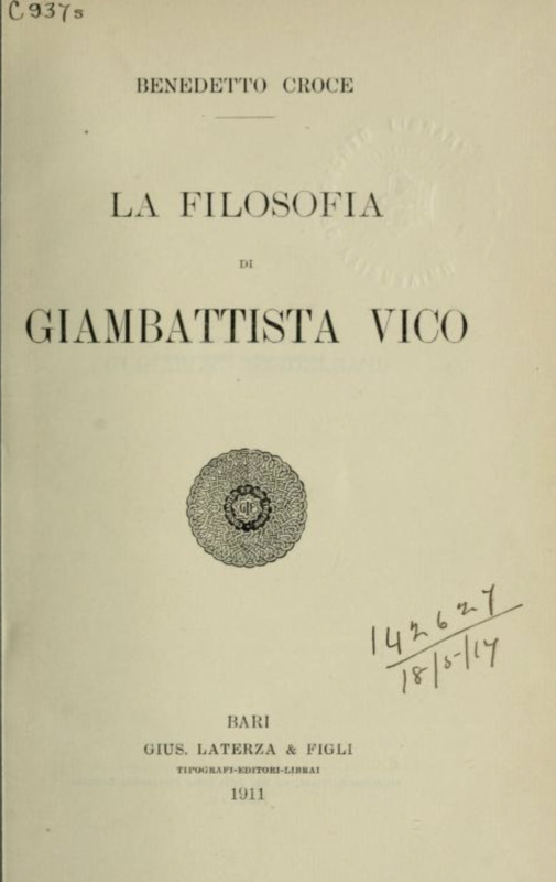 Nel fervido contesto filosofico del primo Novecento, la riscoperta di Giambattista Vico dovette molto alla mediazione di Benedetto Croce, che con il suo saggio La filosofia di Giambattista Vico (Laterza, 1911) ne riportò il pensiero al centro del dibattito europeo. Dedicando ampio spazio a Vico, Croce ne riscopriva la filosofia e ne tracciava un articolato profilo, seppur alla specola dell'idealismo di cui era intriso il proprio pensiero.